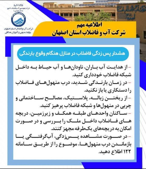 با توجه به بارش شدید باران و افزایش حجم روانآبهای سطحی، شرکت آب و فاضلاب استان اصفهان از شهروندان محترم درخواست میکند به منظور جلوگیری از پسزدگی فاضلاب و بروز مشکلات بهداشتی، به نکات زیر توجه ویژه داشته باشند: