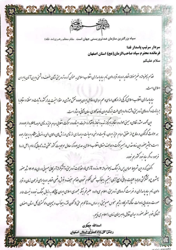 در متن این نامه آمده است: سردار سرتیپ پاسدار فدافرمانده محترم سپاه صاحبالزمان(عج) استان اصفهانسلام علیکماقدام نابخردانه و غیرمسئولانه اتحادیه اروپا در قرار دادن نام سپاه پاسداران انقلاب اسلامی در فهرست گروههای تروریستی، نشاندهنده ضعف و دشمنی دیرین آنان با ایران اسلامی است.سپاه پاسداران انقلاب اسلامی که یکی از ارکان اساسی و مردمی دفاعی ایران بوده، نقشی مؤثر در حفظ امنیت پایدار کشور و ثبات منطقه در مقابله با جریانات تروریستی داشته و دارد و برای ملت بزرگ ایران، نماد فداکاری، جانفشانی و ایثار است. این مجموعه مقتدر نظامی و میهنی همواره در مقابله با هرگونه تهدید و تجاوز با اقتدار و عزت ایستاده و در حرکت انقلابی مردم عزیز در تمامی عرصهها طلایهدار بوده است. در همه حوادث گوناگون، در دفاع از حقوق مردم ایران، تمامیت ارضی و صیانت از ارزشهای والای الهی و انسانی، پیشگام و پرچمدار بوده است.تأثیر حضور این نهاد مقدس در مسیر حرکت و اهداف متعالی انقلاب اسلامی به حدی است که معادل موجودیت کشور تلقی شده، تا جایی که امام راحل (ره) فرمودند: «اگر سپاه نبود، کشور هم نبود.»