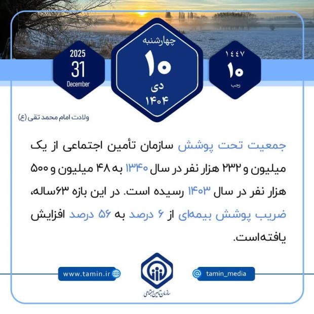 جمعیت تحت پوشش سازمان تأمین اجتماعی از یک میلیون و ۲۳۲ هزار نفر در سال ۱۳۴۰ به ۴۸ میلیون و ۵۰۰ هزار نفر در سال ۱۴۰۳ رسیده است.
