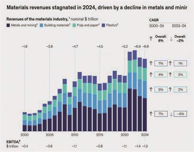 این آزمون بیش از هر چیز در صورت‌های مالی شرکت‌ها نمایان شد. همان‌طور که در شکل شماره ۱ نشان داده شده است، درآمدهای کلی صنعت مواد در سال ۲۰۲۴ دچار رکود شد و ۲ درصد نسبت به سال قبل با یک افت پیدا کرد. داده‌های مکنزی به‌وضوح نشان می‌دهد این افت تقریباً به‌طور کامل ناشی از بخش «فلزات و معدن» بود که به‌تنهایی با یک انقباض ۶ درصدی در درآمد روبه‌رو شد، درحالی‌که سایر بخش‌ها مانند مصالح ساختمانی، رشد اندکی را تجربه کردند. بااین‌حال، سودآوری به طرز قابل‌توجهی تاب‌آور باقی ماند که نشان‌دهنده انضباط هزینه‌ای و قدرت قیمت‌گذاری در این بخش است.
