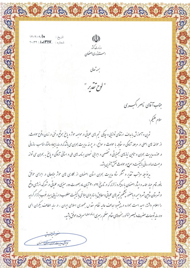 بدینوسیله مراتب تقدیر و تشکر ستاد مدیریت بحران استان اصفهان از همکاریهای موثر جنابعالی در اجرای موفق مانور تمام عمار حماسه و ایثار اصفهان با رویکرد زلزله که در تاریخ 29 و 30 آبانماه بهصورت دور میزی و عملیاتی در شهرک انرژی واقع در شهرستان شاهینشهر و میمه و با حضور چشمگیر تیمهای عملیاتی و مطابق با سناریوی ابلاغی با کیفیت مطلوب و ارزیابی بسیار خوب گردید اعلام داشته، امید است، همواره در پیشبرد اهداف عالیه نظام مقدس جمهوری اسلامی ایران، در سایه الطاف بیکران الهی و در سایه توجهات حضرت ولی عصر (عج) و رهنمودهای مقام معظم رهبری (مدظلهالعالی) سربلند و موفق باشید.»