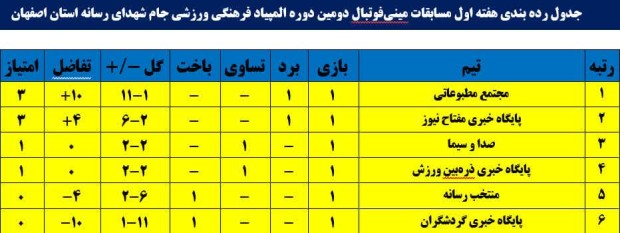 جدول رده بندی هفته اول مسابقات مینی‌فوتبال دومین دوره المپیاد فرهنگی ورزشی جام شهدای رسانه استان اصفهان