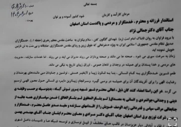 به گزارش پایگاه خبری شهر اصیل و به نقل از پایگاه اطلاع رسانی شرکت توزیع نیروی برق استان اصفهان (پاتنا)جمعی از خانواده‌های معظم شهدا و جانبازان و تعدادی از اشخاص حقیقی وحقوقی شهر نوش‌آباد با ارسال طوماری خطاب به استاندار محترم استان اصفهان، از اقدامات ارزشمند و مؤثر مهندس محمد مرادی مدیرعامل و مهندس بهمن زیاری معاون برنامه‌ریزی شرکت توزیع نیروی برق استان اصفهان تقدیر و تشکر کردند.
