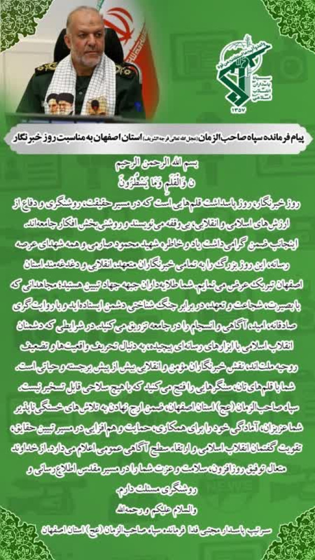 شما با قلمهایتان، سنگرهایی را فتح میکنید که با هیچ سلاحی قابل تسخیر نیست. سپاه صاحبالزمان (عج) استان اصفهان، ضمن ارج نهادن به تلاشهای خستگیناپذیر شما عزیزان، آمادگی خود را برای همکاری، حمایت و همافزایی در مسیر تبیین حقایق، تقویت گفتمان انقلاب اسلامی و ارتقاء سطح آگاهی عمومی اعلام میدارد.