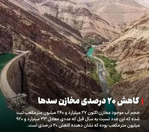 حجم آب موجود مخازن اکنون ۲۷ میلیارد و ۲۶۰ میلیون مترمکعب ثبت شده که این عدد نسبت به سال قبل که عددی معادل ۳۳ میلیارد و ۹۲۰ میلیون مترمکعب بوده که نشاندهنده کاهش ۲۰ درصدی است.