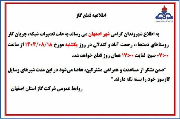 اطلاعیه قطع گاز به دلیل تعمیرات شبکه در تعدادی از روستاها در محدوده شهر اصفهان در روز یکشنبه