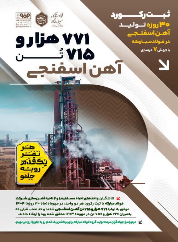 تلاشگران واحدهای احیاء مستقیم ۱ و ۲ ناحیه آهنسازی شرکت فولاد مبارکه با ثبت رکورد هر دو واحد، در مهرماه(ماه ۳۰ روزه) ۱۴۰۴ موفق به تولید ۷۷۱ هزار و ۷۱۵ تن آهن اسفنجی شدند و حد نصاب قبلی که بهمیزان ۷۲۰ هزار و ۷۵۰ تن در مهرماه ۱۴۰۳ محقق شده بود را ارتقاء دادند.