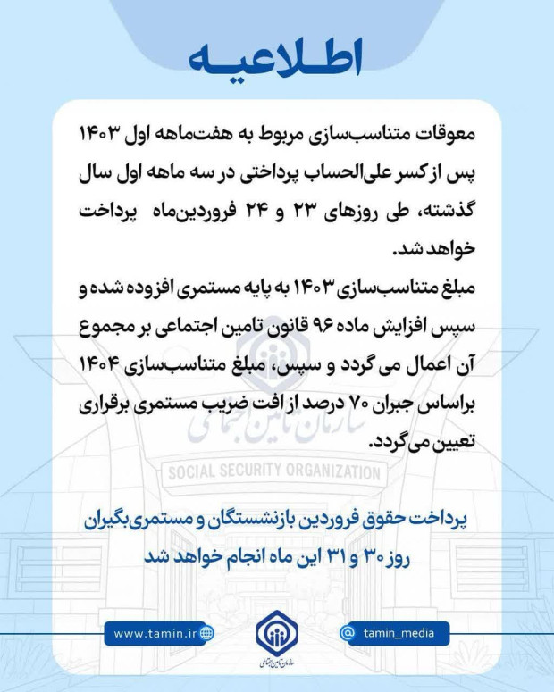 🔶 پرداخت حقوق فروردین بازنشستگان و مستمریبگیران، در روزهای ۳۰ و ۳۱ فروردین انجام خواهد شد.