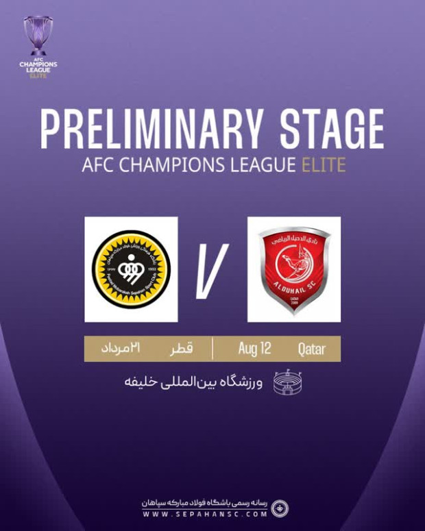 بنابر اعلام باشگاه فولاد مبارکه سپاهان، کنفدراسیون فوتبال آسیا (AFC)، زمان رسمی دیدار تیمهای سپاهان ایران و الدحیل قطر را اعلام کرد. بر این اساس، تیمهای فولاد مبارکه سپاهان ایران و الدحیل قطر در چارچوب پلی آف لیگ نخبگان آسیا سهشنبه ۲۱ مرداد ۱۴۰۴ در استادیوم خلیفه قطر به مصاف هم خواهند رفت.