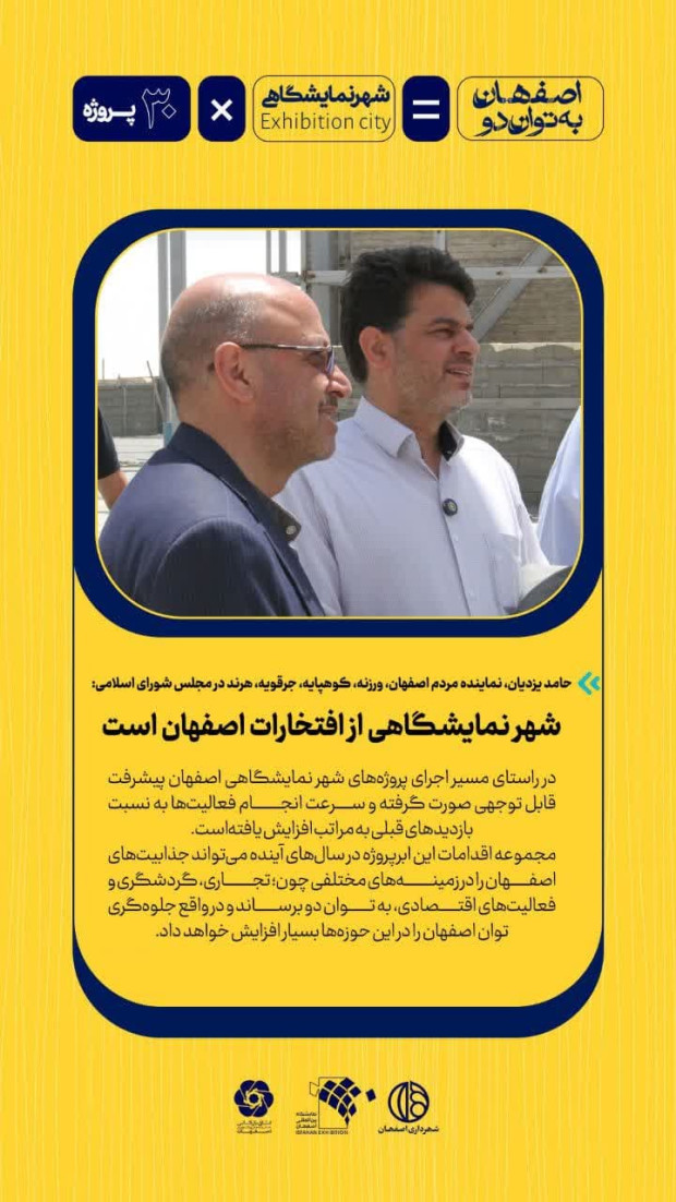 🔸 در راستای مسیر اجرای پروژه‌های شهر نمایشگاهی اصفهان پیشرفت قابل توجهی صورت گرفته و سرعت انجام فعالیت‌ها به نسبت بازدیدهای قبلی به مراتب افزایش یافته‌است.