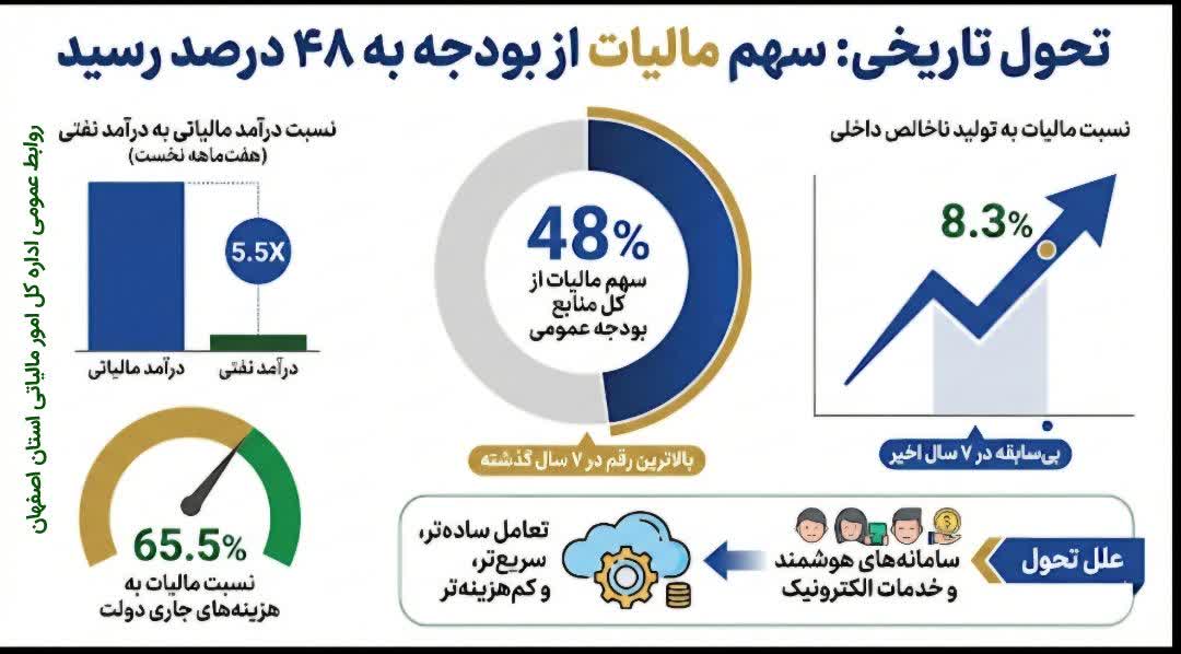 - سهم مالیات از کل منابع بودجه عمومی به ۴۸ درصد افزایش یافته که بالاترین رقم در ۷ سال گذشته است.
